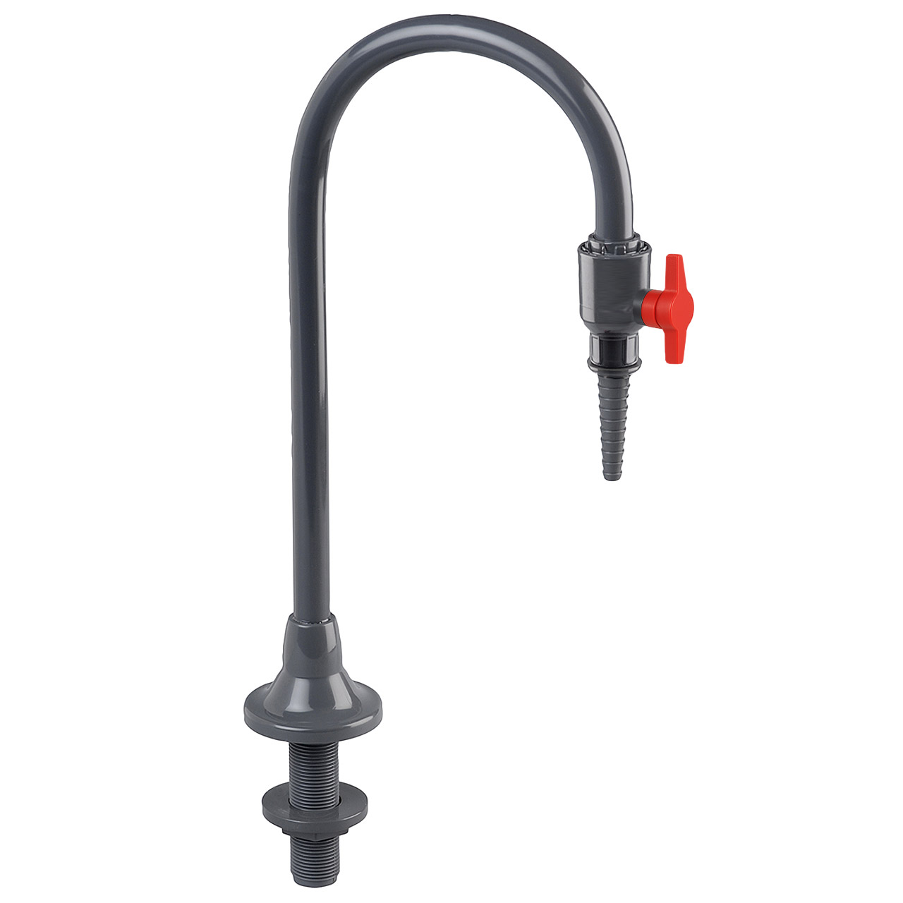 PVC Laboratory Gooseneck Faucet, Deck Mnt, 1/4 Turn Lab Control Ball Valve, 3/8" Fem NPT Inlet Conn, Rem Ser Barb Tip, Front Handle